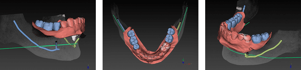 行う仮想手術ガイデッドサージェリーはCTからとった歯と骨のデジタルデータと、歯型から取った歯と歯茎のデータをマッチングさせることにより、パソコン上に完全な状態で患者様のお口を再現することができます。これによりインプラント手術をパソコン画面上で仮想で行うことが可能になります。